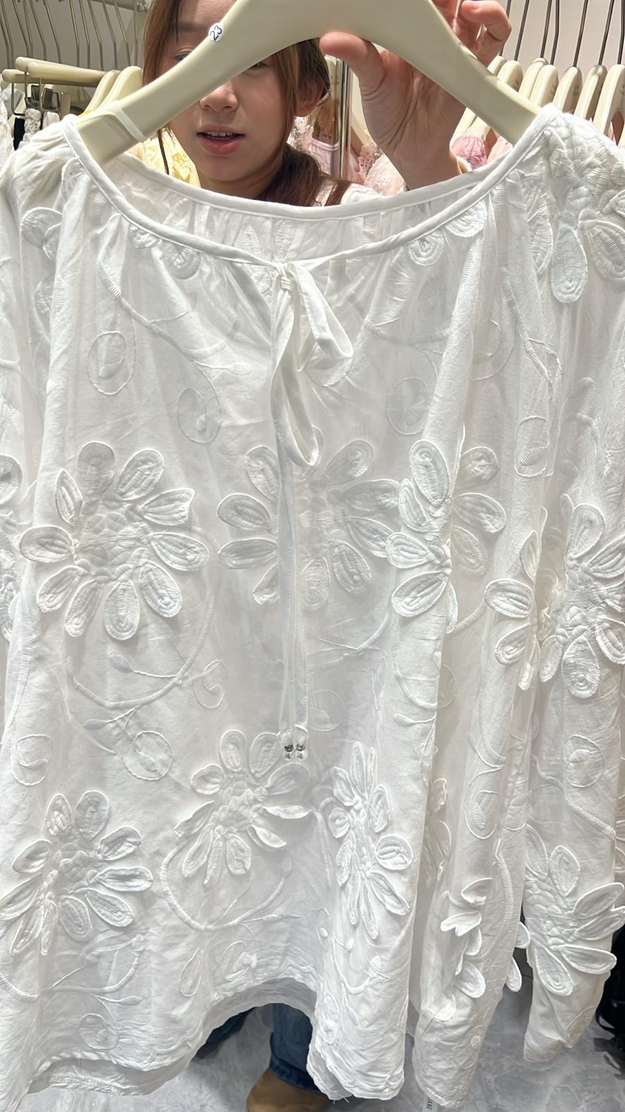 3868S WHITE BOHO, LACE BLOUSE, LOOSE FIT, with EMBROIDERED FLORAL PATTERN