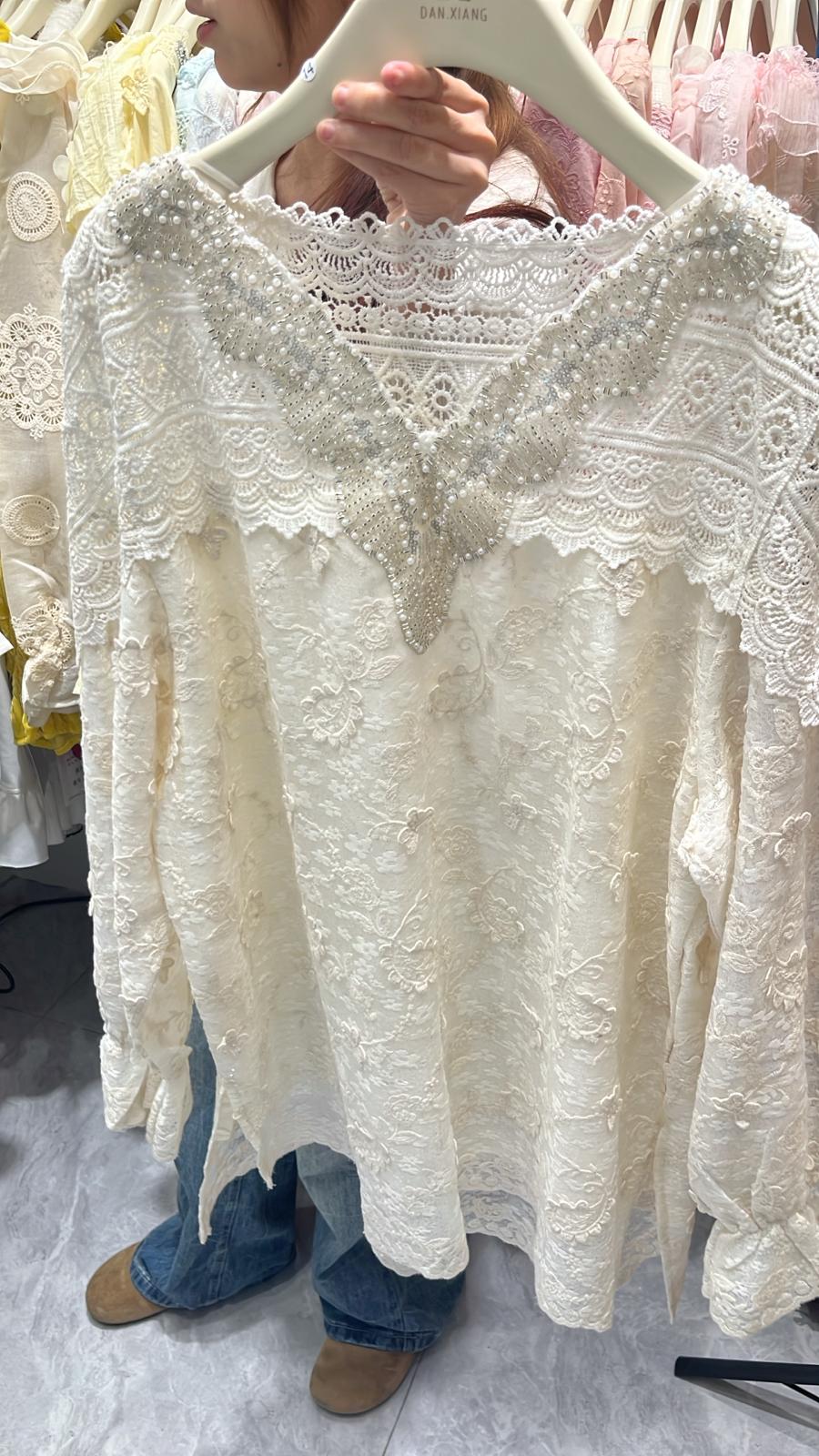 3855S WHITE ELEGANT, LACE BLOUSE, LOOSE FIT, with PEARL EMBELLISHMENTS