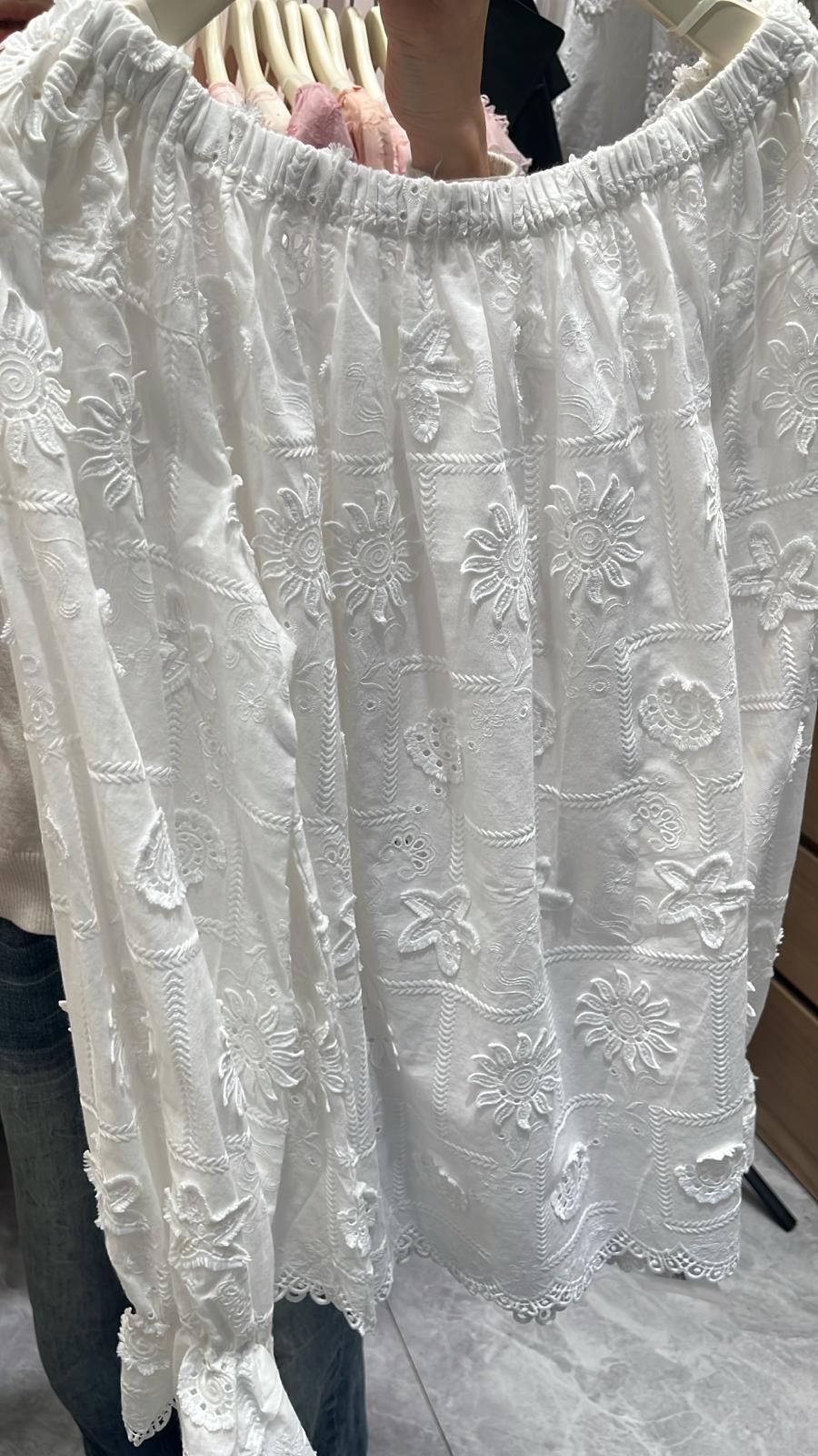 3846S WHITE BOHO, LACE BLOUSE, RELAXED FIT, with FLORAL EMBROIDERY