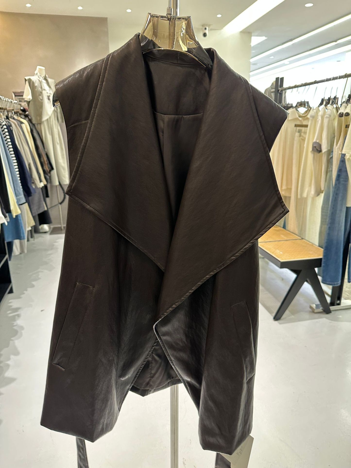 3608S BROWN CASUAL MINIMALIST LEATHER LONG VEST