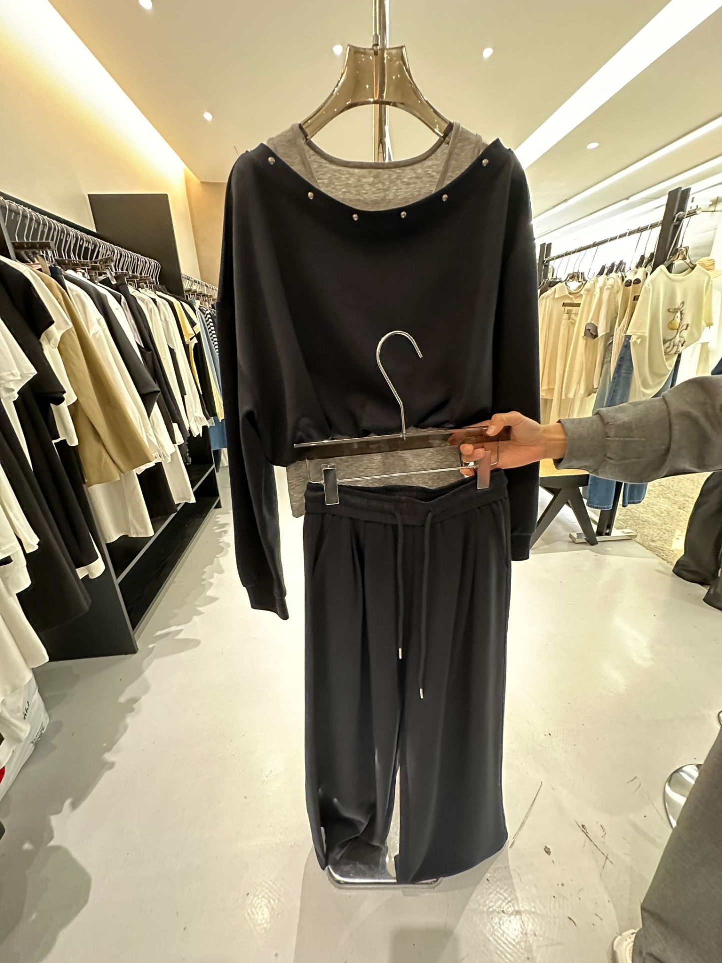 3609S BLACK CASUAL, MINIMALIST SET, SWEATER & TROUSERS, RELAXED FIT, with STUDDED NECKLINE