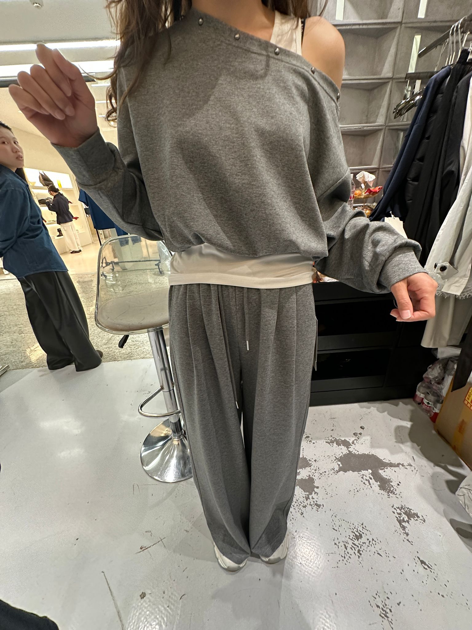 3610S GRAY CASUAL, MINIMALIST SET, SWEATER & TROUSERS, RELAXED FIT, with OFF-SHOULDER DETAIL