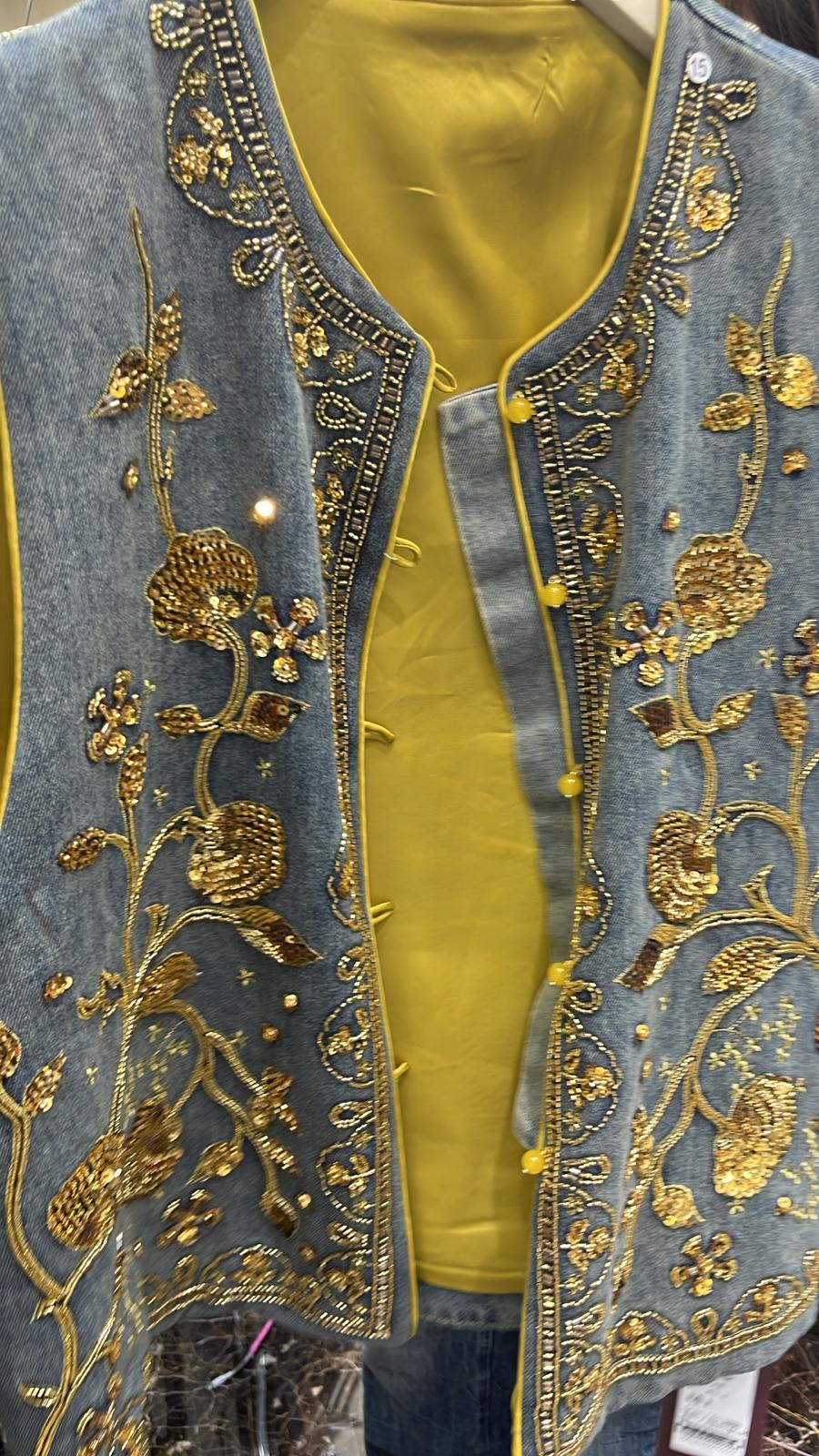 3714S YELLOW VINTAGE, DENIM VEST, TAILORED FIT, with EMBROIDERED FLORAL DETAILS