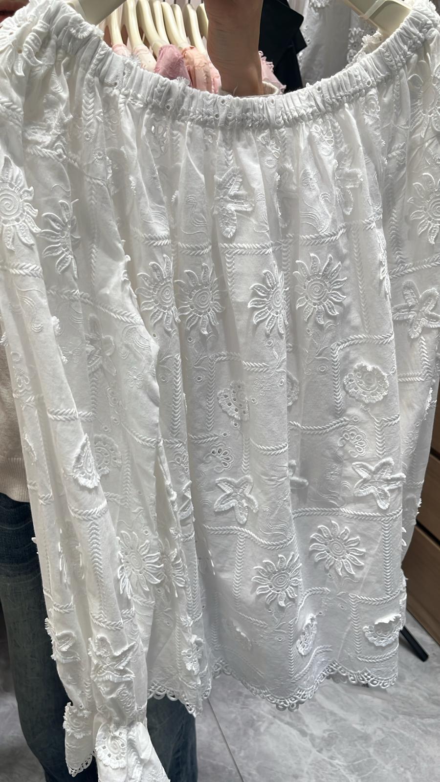 3868S WHITE BOHO, LACE BLOUSE, LOOSE FIT, with EMBROIDERED FLORAL PATTERN