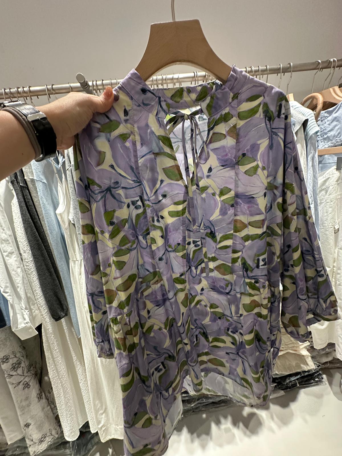 6425A PURPLE BOHO, FLORAL BLOUSE, RELAXED FIT, WITH TIE NECK DETAIL