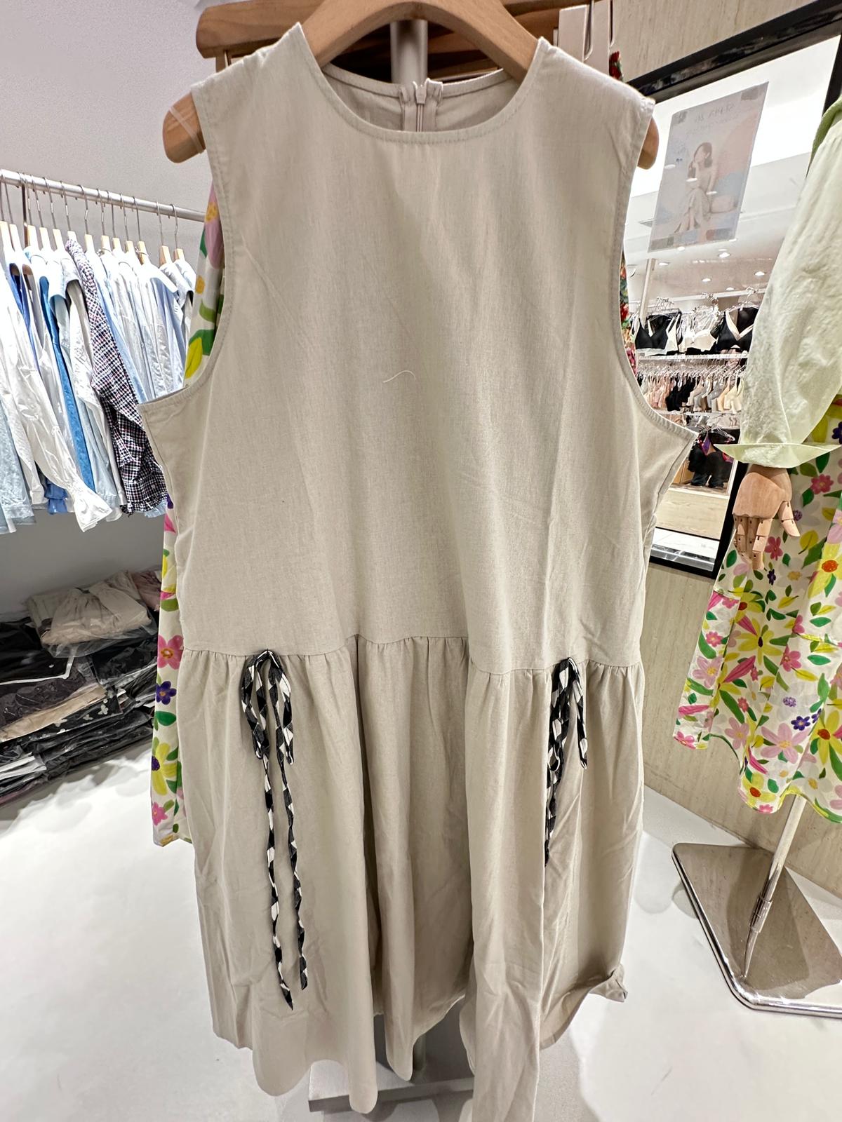 6431A BEIGE MINIMALIST, LINEN DRESS, RELAXED FIT, WITH DRAWSTRING WAIST